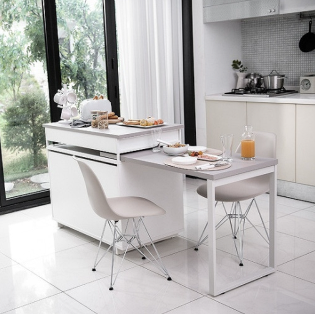 사이즈는 2인용 식탁이며 1인 가구 및 2인 가구에게 딱 좋은 사이즈입니다. 슬라이딩 식탁 형태여서 집안 공간을 더욱 넓게 활용할 수 있습니다.조리대로도 사용 가능하며 하단에는 수납장이 함께 있어서 주방을 깔끔하게 관리하기에 좋습니다. 슬라이딩 식탁을 어떻게 배치하느냐에 따라 ㄱ자 식탁으로도 활용 가능하고, 일자 식탁으로도 쓸 수 있습니다.