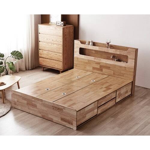 매트리스를 들면 벙커형 수납 공간이 있어서 계절용 옷 등을 보관하기 좋고요, 사이드에는 서랍형 수납 공간이 있어서 실용적으로 사용하기 좋습니다. 헤드보드에도 수납 공간이 물론 있으며, LED 조명등과 핸드폰 충전을 위한 충전구도 있습니다.