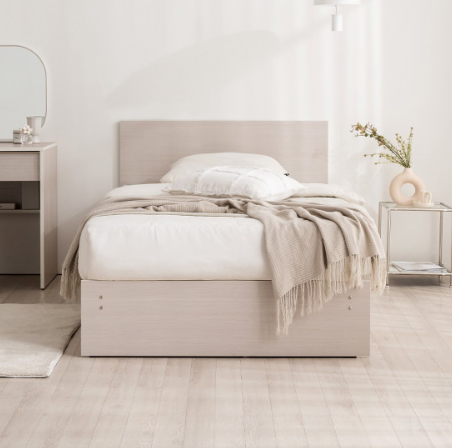 아이보리 워시와 내추럴 우드 컬러가 있으며, 두 색상 모두 어느 인테리어에나 잘 어울리는 컬러여서 유행도 타지 않고 오래 사용하기 좋을 것 같네요. 침대 하단에는 서랍형 수납공간이 있어서 의류 등을 보관하기에 좋습니다. 미니멀한 디자인으로 심플한 침대를 선호하는 분들에게 추천드리고 싶습니다.